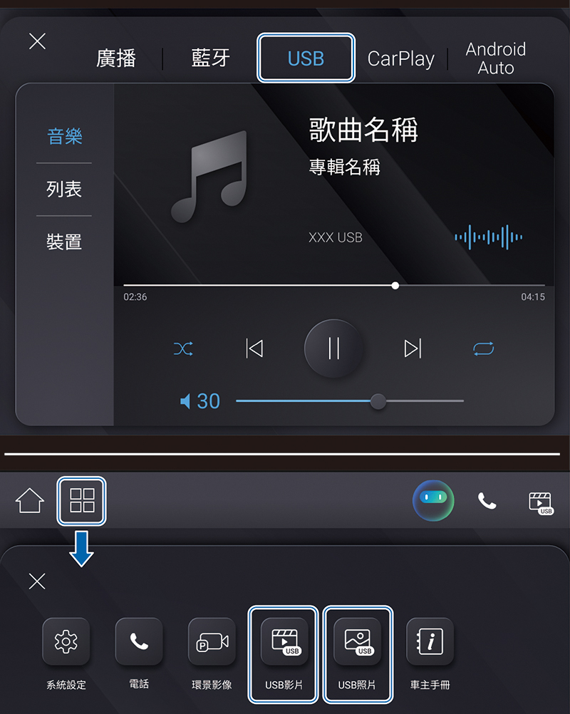 點選影音娛樂功能按鈕,然後點選“USB”,即可進入 USB 的音樂播放功能畫面;點選應用程式選單,然後點選 “USB 照片”或“USB 影片”即可播放相應的影音功能。