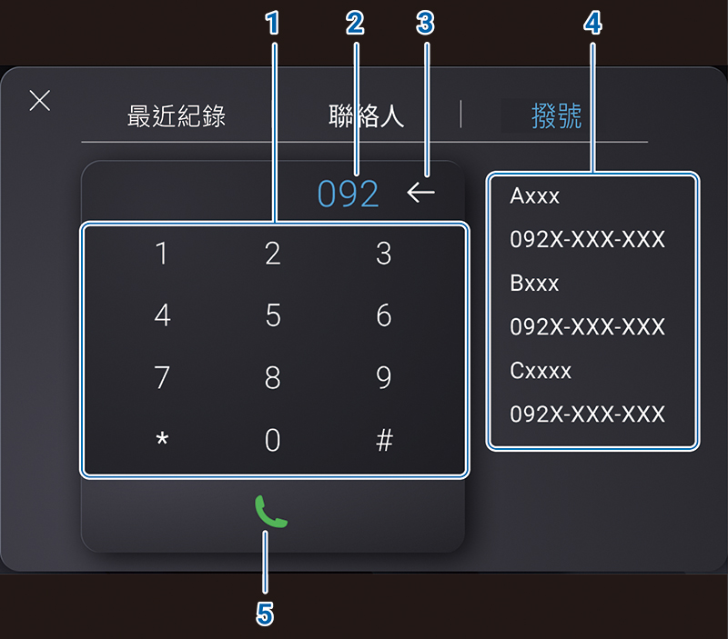如近期通話紀錄或聯絡人的資訊有符合輸入區的號碼,相應的資料將會顯示於此區中。