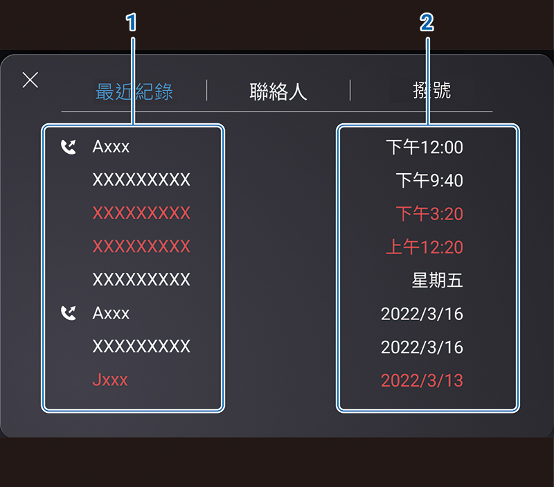 本功能需要在藍牙配對時有設定分享裝置中的通話紀錄後才能作用;如尚未設定資料分享時,則本功能將不會顯示任何紀錄且系統會跳出提示訊息,請進行設定變更然後重新操作。