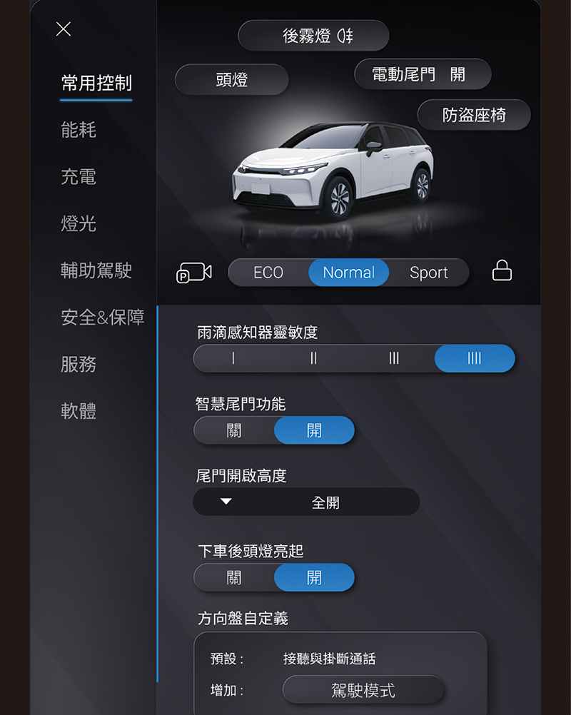 可對方向盤右側的快捷按鍵可執行的功能進行切換設定。系統預設點選快捷按鍵時可接聽或掛斷通話;如將“駕駛模式”功能設定為開啟時 (按鈕呈藍色),點選快捷按鍵可進行駕駛模式的切換 (ECO → Normal → Sport)。 -