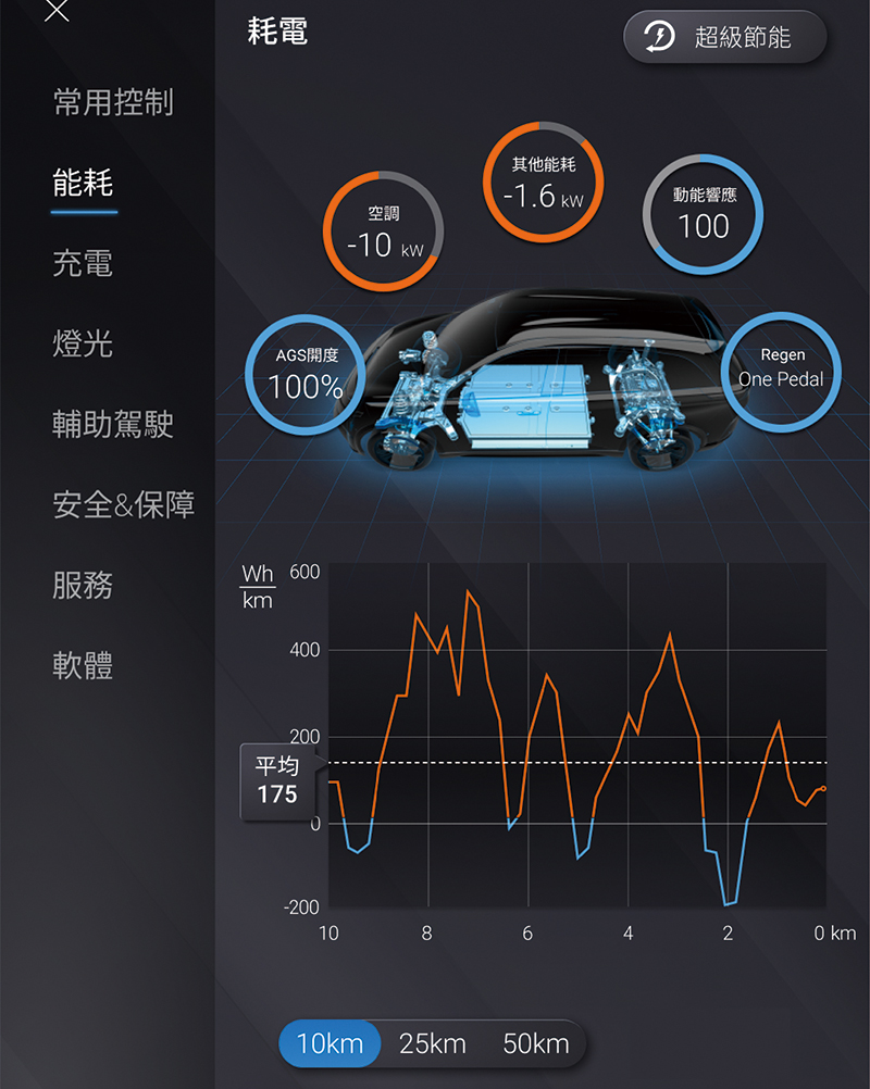 本功能亦可以圖表方式呈現目前的功率消耗情況。透過下方的里程 / 區間設定,可自行定義顯示的資訊。