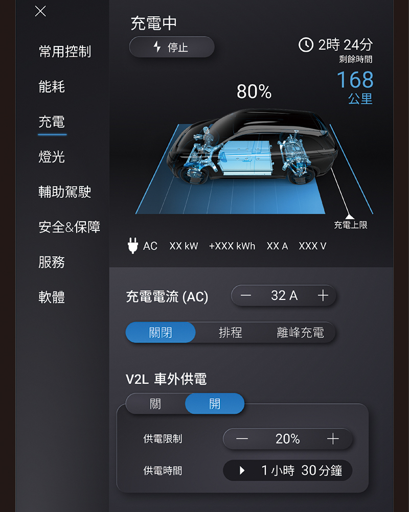 點選“車輛控制設定”然後點選“充電”可執行充電功能的相關操作。更多關於充電功能的資訊,請參閱車主手冊 “充電”章節中的說明。