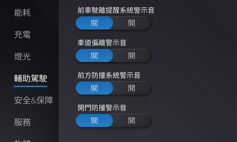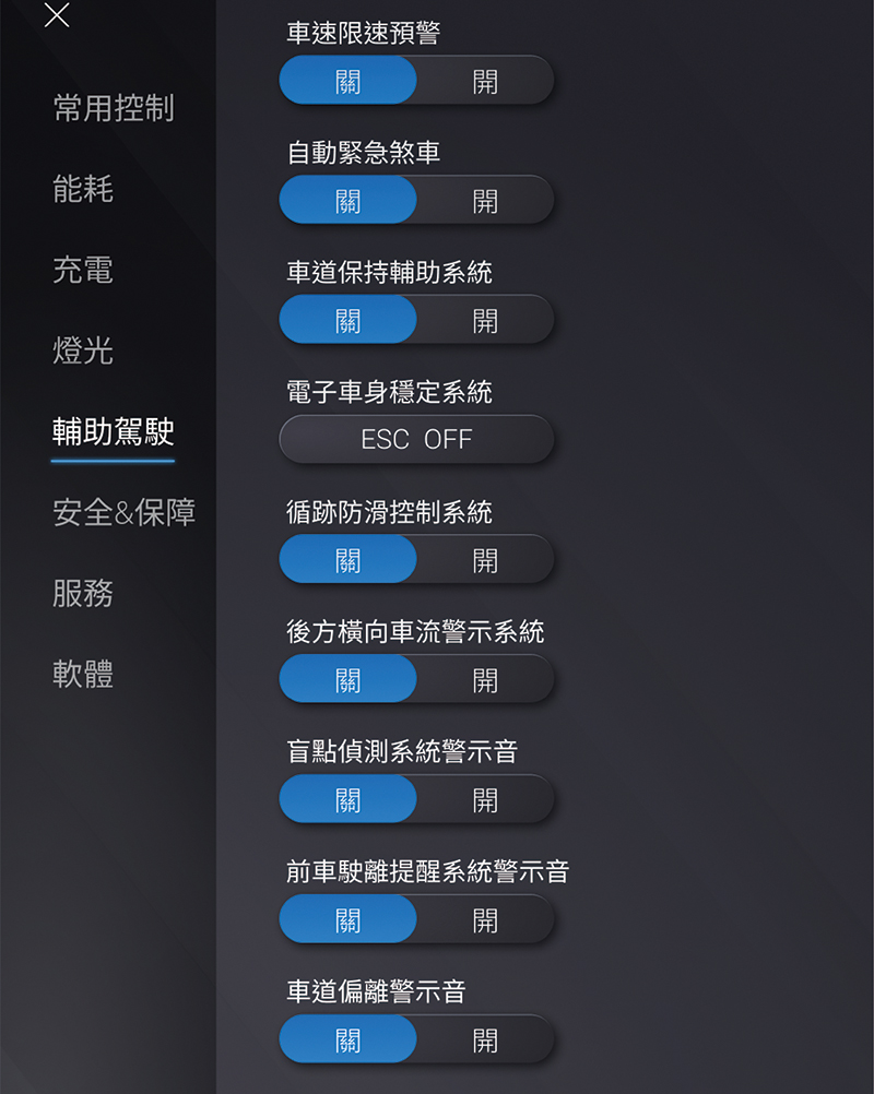 點選“車輛控制設定”然後點選“輔助駕駛”即可開啟 / 關閉先進駕駛輔助的相關功能設定。