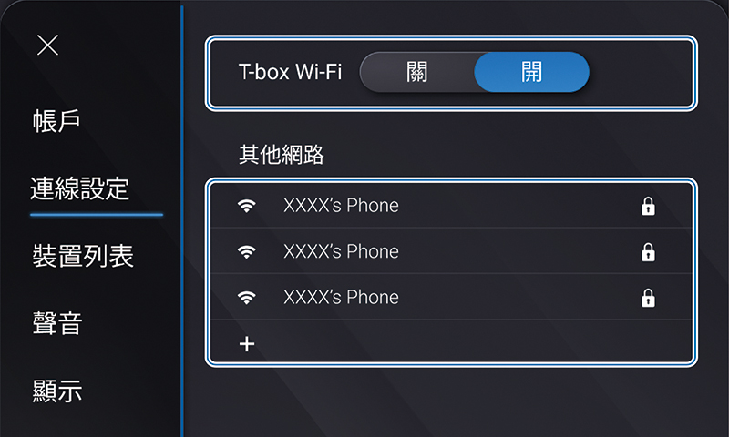 點選“連線設定”然後點選“T-box Wi-Fi”可開啟 / 關閉 Wi-Fi 功能;當開啟 Wi-Fi 時,下方畫面會列出系統所偵測到周圍的 Wi-Fi 訊號。