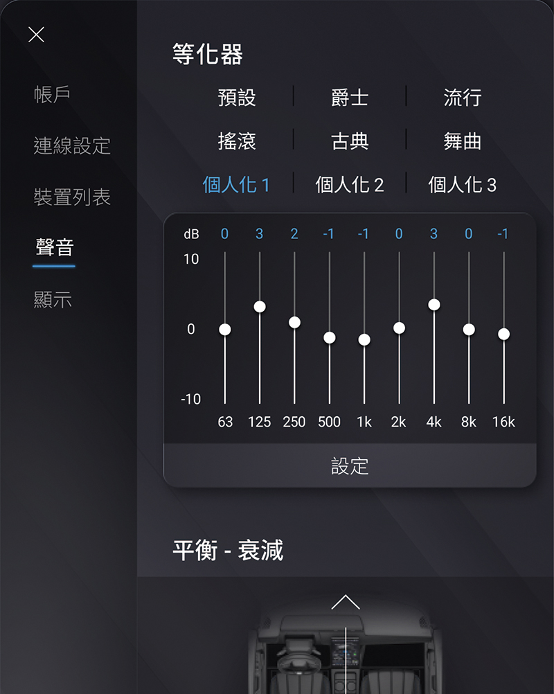 本項目可設定系統播放影音娛樂功能時的音效模式。本設定可手動自行調整音效值 (個人化 1~3),或選擇“預設”、“爵士”、“流行”、“搖滾”、“古典”或“舞曲”等六種內建的音效模式。