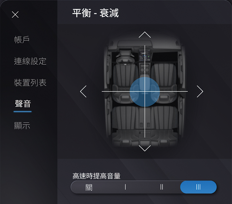 本項設定可調整車內揚聲器輸出影音娛樂時的音效及相關音效的設定,包括“等化器”、“平衡–衰減”、“高速時提高音量”、“倒車時降低音量”、“觸控提示音”、“效果音開關”、“語音音量調整”及“重設”。可向下滑動畫面並依照個人需求進行各項聲音的功能操作。