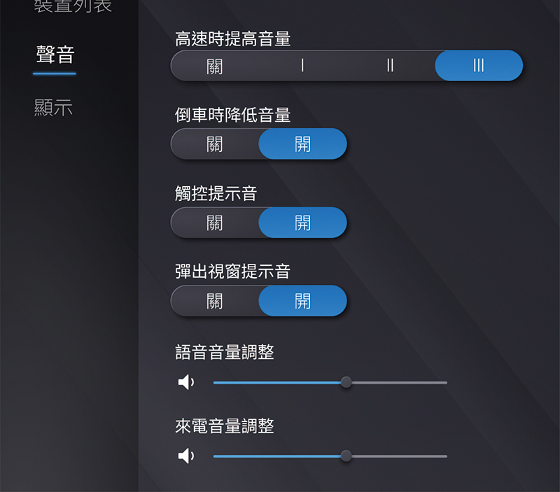 高速提高音量功能開啟時,當車速分別超過設定值時 (60 km/h 及 90 km/h 以上),系統會依照設定值提高目前播放中影音媒體的音量;當車速降低時,系統會降低補償值或恢復原先音量設定大小。