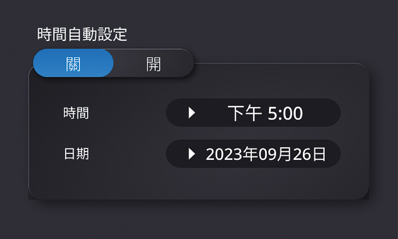 當時間自動設定功能切換至關閉時,系統會顯示手動調整的設定畫面。可自行調整所在位置的時間與日期資訊。