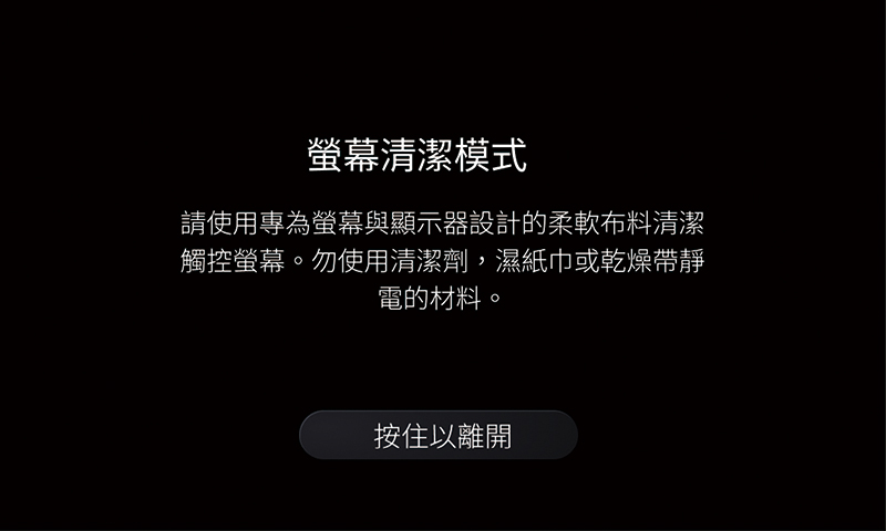 點選可將螢幕切換至全黑畫面,僅於畫面下方顯示說明文字。請依提示說明進行螢幕的清潔。若要返回 LuxConnect 的操作介面,請以手指按壓“按住以離開”的按鈕約 3 秒鐘即可返回操作介面。