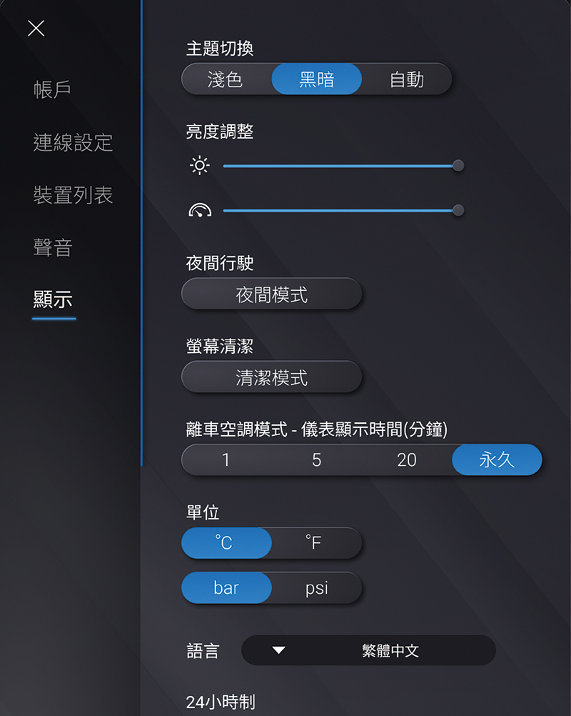 點選“系統設定”→“顯示”可在各設定選單中,點選或切換可調整“主題切換”、“亮度調整”、“夜間行駛”、“螢幕清潔”、“離車空調模式 - 儀表顯示時間 (分鐘)”、“單位”、“語言”、“24小時制”、“時間自動設定”或“重置所有預設通知”等設定。