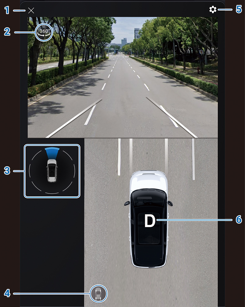 點選此按鈕後可於上方畫面顯示以車輛為中心點位置的整車環景畫面;點選影像切換可依個人需求顯示相對應的環景影像。