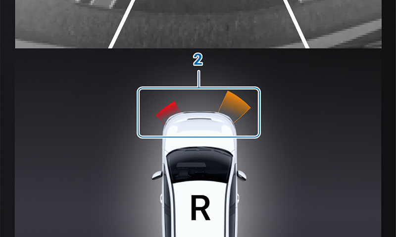 當相關的停車雷達感知器在指定的範圍內偵測到障礙物時,顯示螢幕上與其相對應之位置的停車雷達偵測指示 1 (配備環景影像車型) / 2 (未配備環景影像車型) 便會亮起。