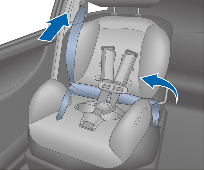 - 將安全帶舌片繞過兒童安全座椅並插入扣環中直到您聽見並感到鎖上為止。請確實遵循兒童安全座椅製造商之安全帶配戴說明。