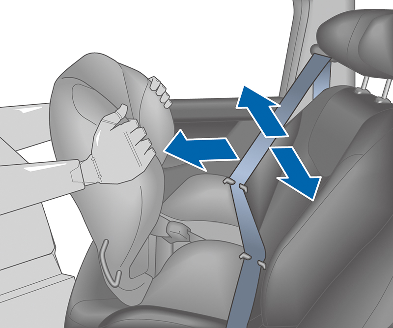- 將兒童放入兒童安全座椅之前,請握住靠近安全帶路徑附近的兒童安全座椅部位,然後用力左右搖動兒童安全座椅,並試著將它用力向車前拉以檢查兒童安全座椅是否已確實被固定住。可搖動的距離不應多於 25 公釐,若搖動距離超過 25 公釐,再一次拉動安全帶使兒童安全座椅緊固。若無法緊固安全座椅請更換至其它後座位置再試一次或使用其它兒童安全座椅。並非所有的兒童安全座椅皆適用於所有的車輛。