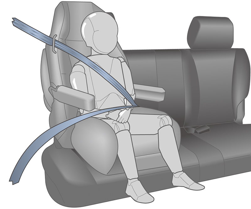 - 請將安全帶腰帶部分繫低,使其緊貼附於兒童之髖部。請確實遵循輔助坐墊製造商關於安全帶調整的說明。