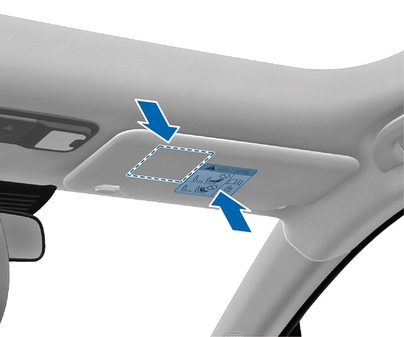 有關 SRS 輔助氣囊系統的警告標籤貼附於如圖所示的遮陽板外側與內側位置。