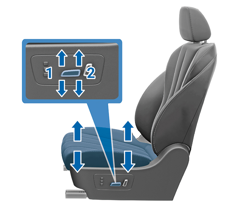 將開關前側 1 往上拉或往下壓,可調整椅墊前側高度。將開關後側 2 往上拉或往下壓,可升高或降低座椅本身的位置。