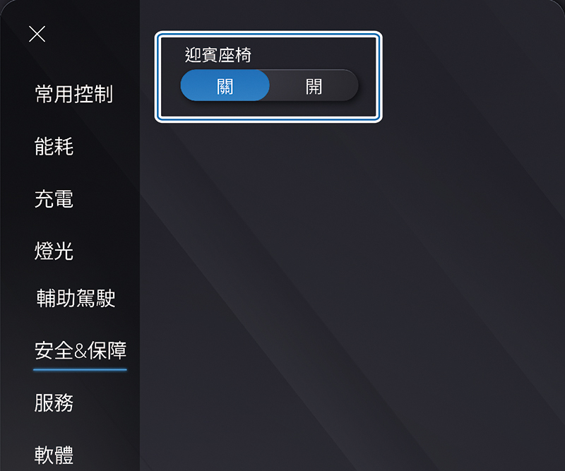 如要關閉迎賓座椅功能, 可將 LuxConnect 的“安全 & 保障”>“迎賓座椅”功能設定為關閉即可。