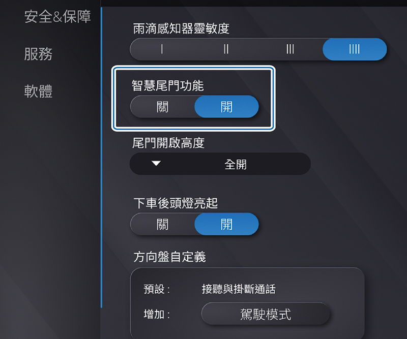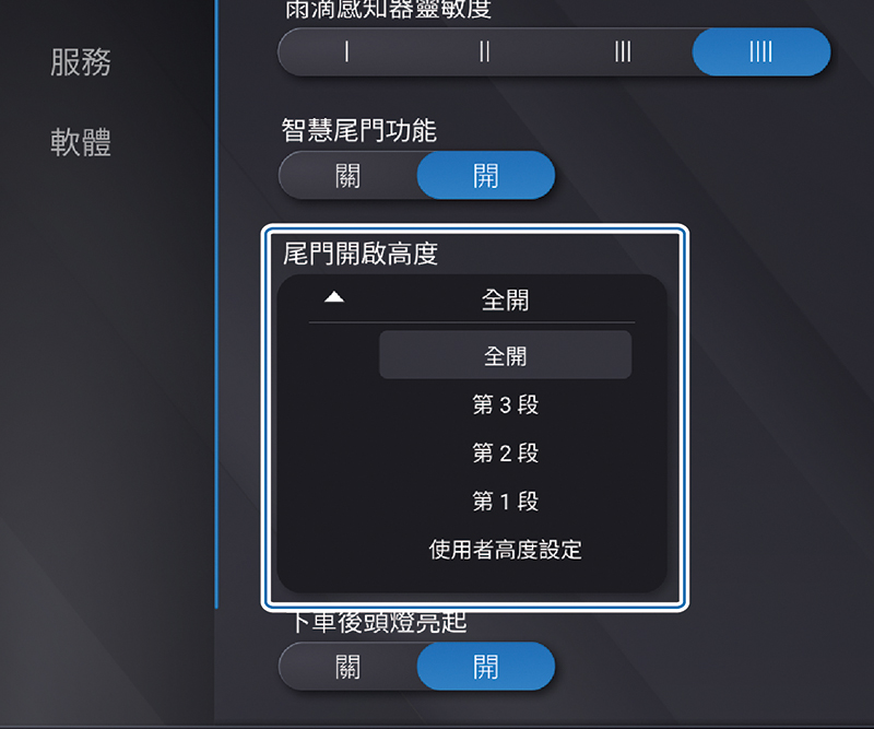 點選“尾門開啟高度”按鈕,可依照所需將電動尾門開啟高度設定至“全開”、“第 3 段”、“第 2 段”、“第 1 段”或“使用者高度設定”位置。點選所需高度位置後即完成設定;執行電動尾門開啟時,系統將依照設定自動調整電動尾門的開啟高度。