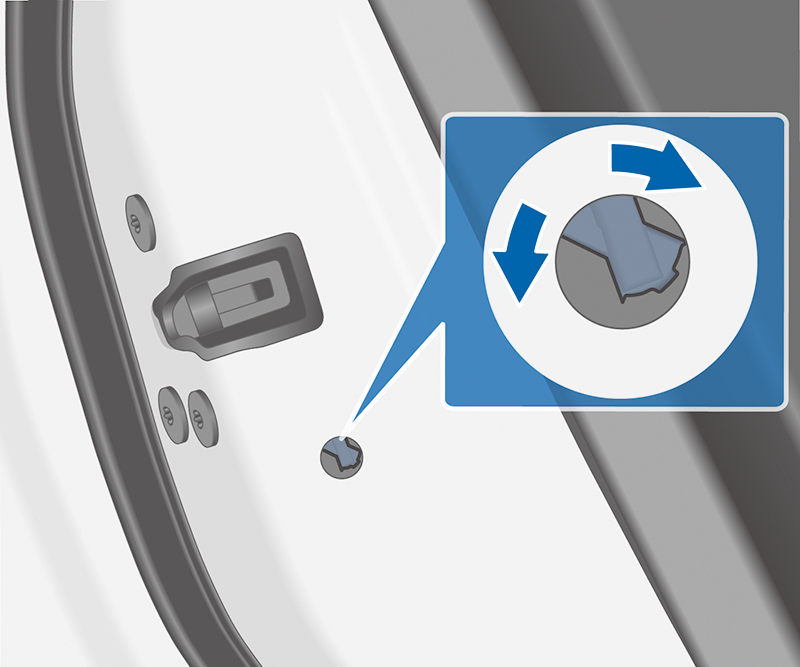 當後座椅有乘坐兒童時,為避免因兒童意外開啟後車門而造成危險或意外事故,請將後車門兒童安全鎖旋鈕朝逆時針方向 (LOCK 位置) 轉動。此時,後車門僅能由其外側車門把手來開啟,後車門內把手的車門開啟 / 關閉功能此時將無法作動。