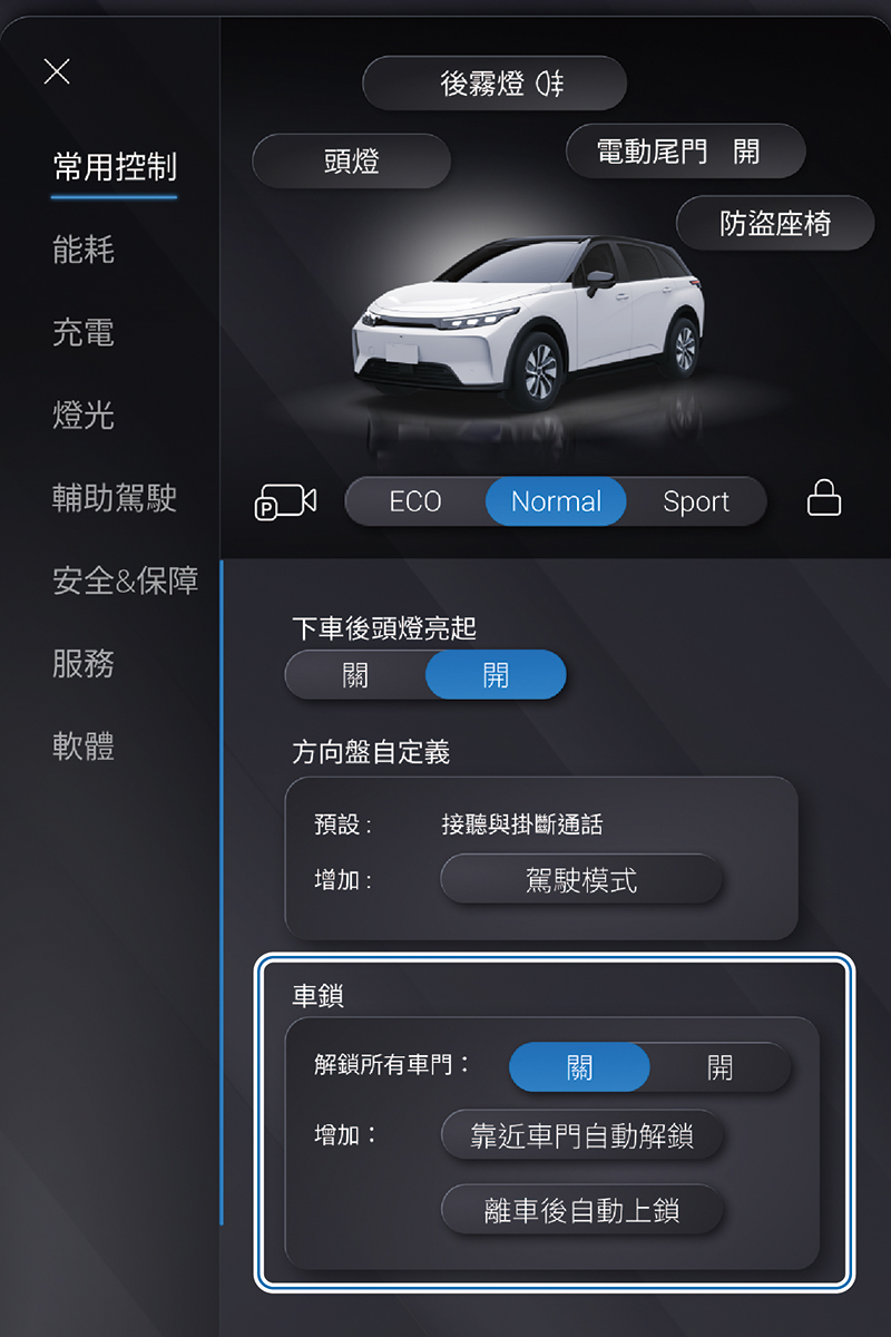 開啟此功能時,執行車輛解鎖時可解除所有車門的鎖定裝置;關閉此功能時,執行車輛解鎖時,僅會解除駕駛側車門的車門鎖。
