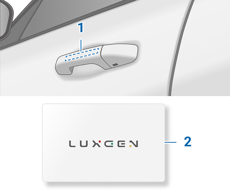 請攜帶 NFC 感應卡片 2,並於靠近車輛時,以 NFC 感應卡片碰觸車門把手的感應區域 1,如此即能對執行車門上鎖 / 解鎖的功能操作。