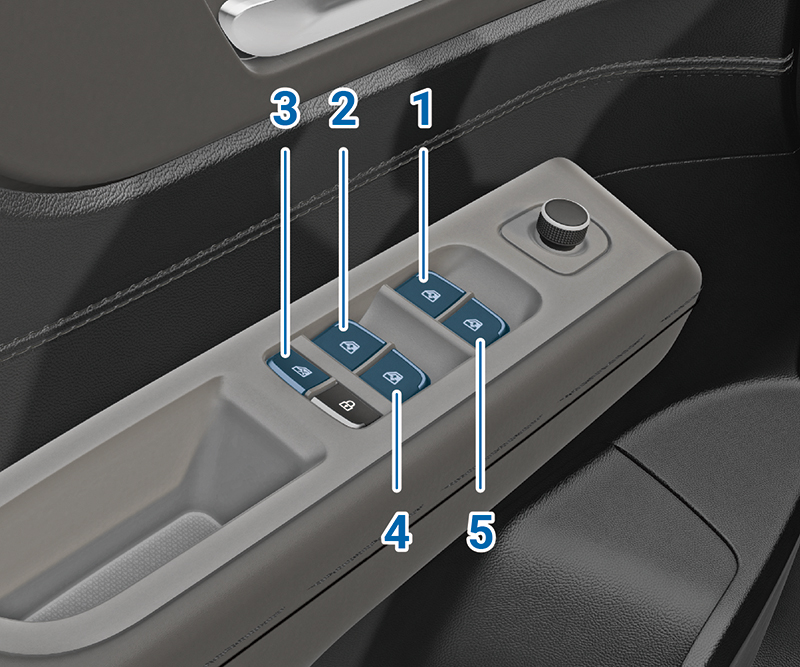 持續按下任一開關 (1、2、4、5),其相對應的電動窗即可下降;持續向上扳起開關,其相對應的電動窗即可升起。操作時如放開開關會使電動窗的作動停止。