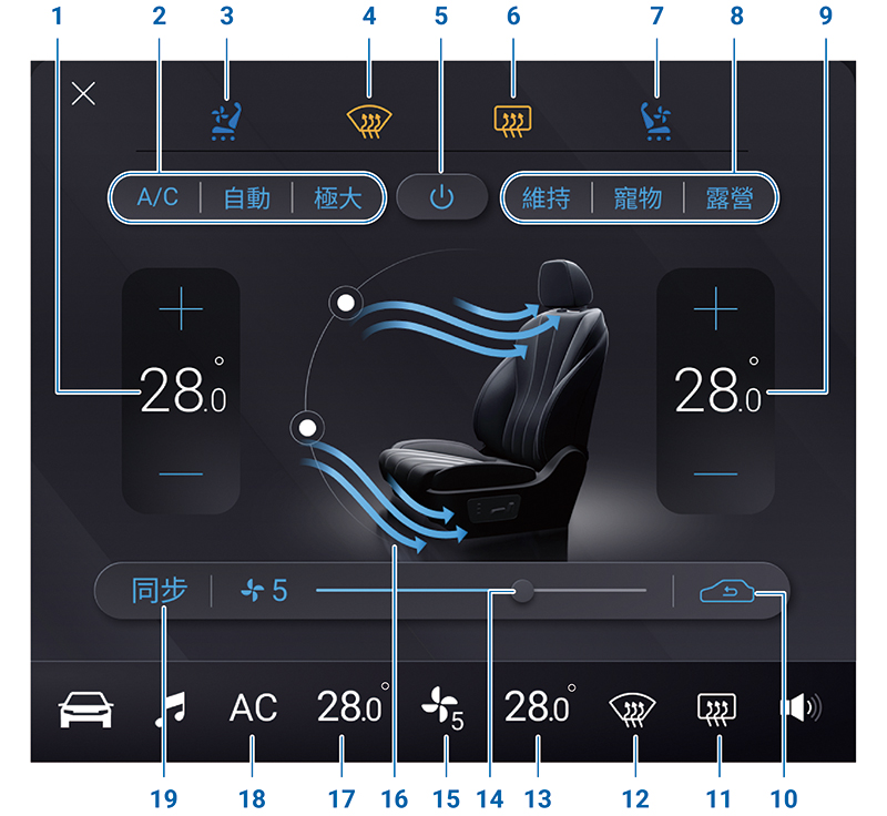 點選“同步”按鈕時 (按鈕呈藍色),空調面板所設定的溫度將同步作用於駕駛側與乘客側空調溫度。再次點選“同步”按鈕 (按鈕呈白色) 則會解除同步設定,此時駕駛側溫度與乘客側溫度將可以個別設定,可自行調整所需要的空調溫度。