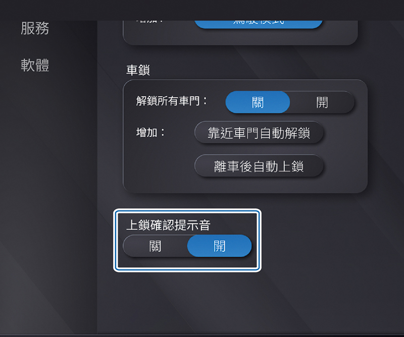 透過 LuxConnect“常用控制”中的“上鎖確認提示音”功能可設定車輛上鎖時系統提示音的開啟或關閉。