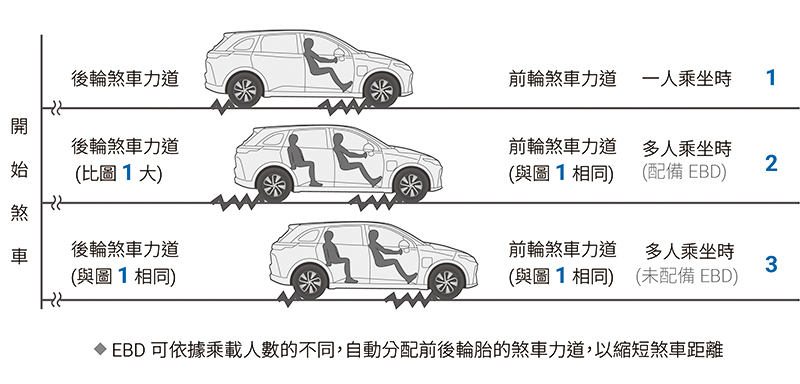 您無須特別操作本系統,系統會依據車輛負載自動分配前後輪煞車力。