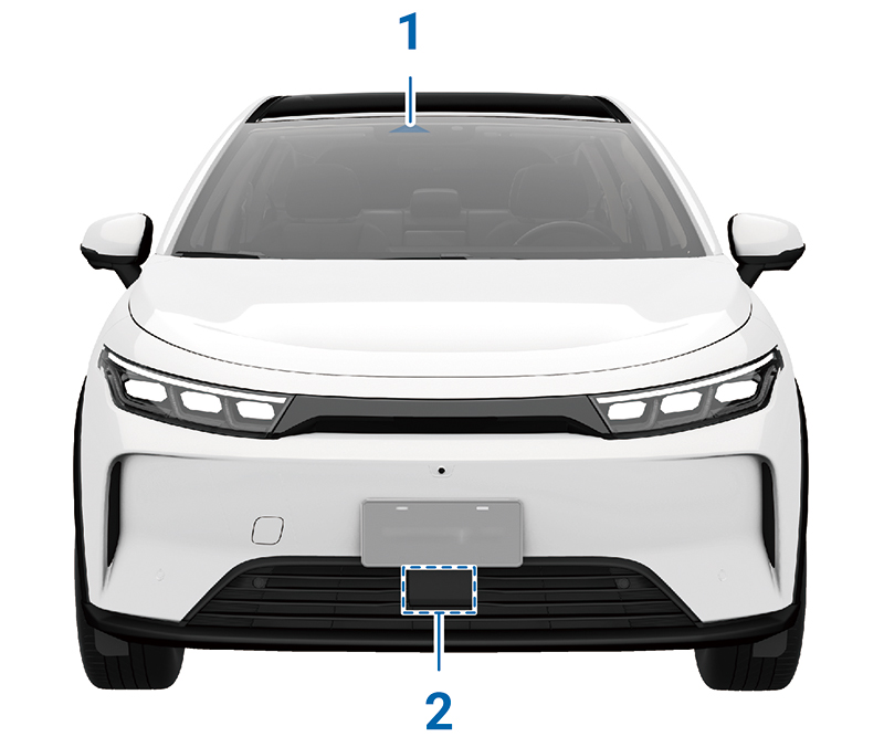 本車輛利用設置在前擋風玻璃上的ADAS 前鏡頭 1 以及前保險桿中央的毫米波雷達 2 來蒐集必要的影像及位置距離資訊,並透過電腦運算、監測及作動來提供主動駕駛安全輔助的功能,以確保行車安全。