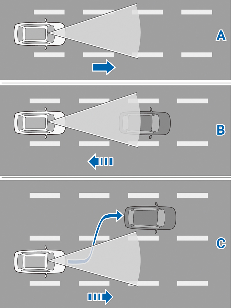 - 當前方沒有車輛行駛時,車距控制模式會在設定速度的範圍內 (30 到160 km/h 間) 保持由駕駛者所設定的速度。