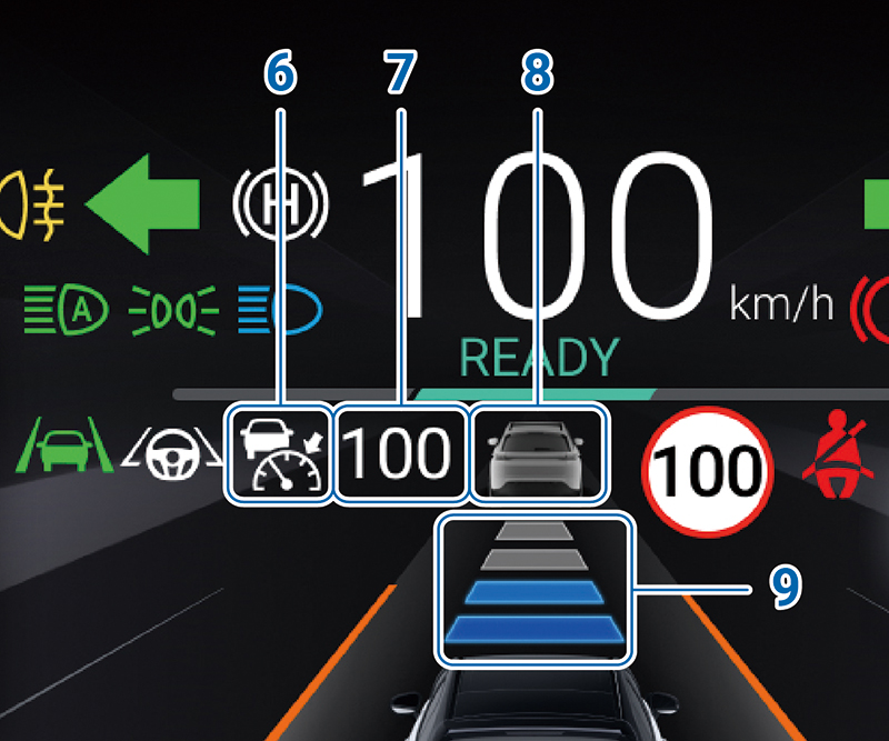 - 如車速為 0 km/h 且前方 2~5 公尺內有車輛時,踩下煞車踏板並將車速設定撥桿 5 朝 SET/– 2 撥動,即可啟動 ACC 功能。當前車駛離後,輕踩電門或朝 RES/+ 3 方向撥動車速設定撥桿 5 即可以 30 km/h的速度行駛。