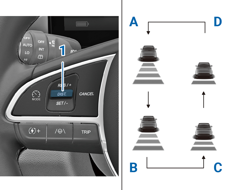 當主動車距巡航系統作用時,連續按下DIST 車距設定按鍵 1 即可依上圖所示順序變更車距的設定。