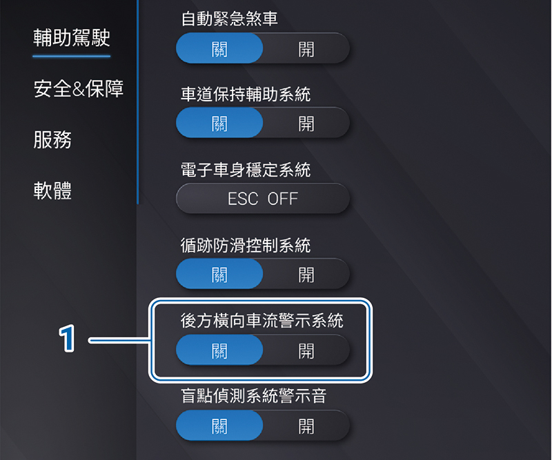 後方橫向車流警示系統可透過 LuxConnect 的“輔助駕駛”功能的“後方橫向車流警示系統” 1 按鈕來進行開啟與關閉。