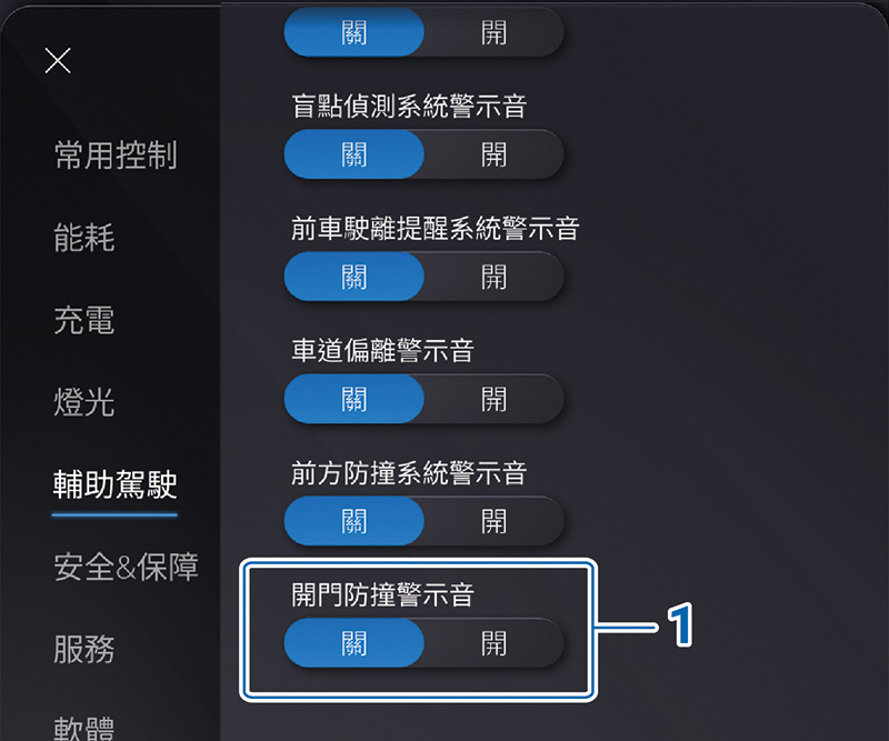 開門防撞警示系統警示音可透過 LuxConnect 的“輔助駕駛”>“開門防撞警示音” 1 按鈕來開啟或關閉系統警示音的功能。