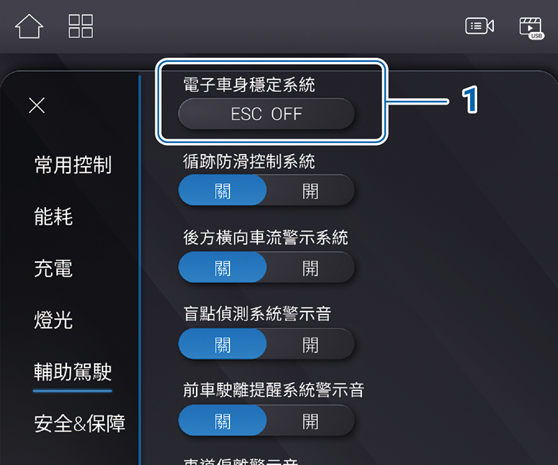 - 當電源設定至 ON 狀態時,ESC 預設為開啟狀態,如欲關閉 ESC 功能,可透過 LuxConnect 的“輔助駕駛”>“電子車身穩定系統” 1 按鈕來進行關閉。再次按下開關或重新啟動車輛,ESC 則恢復開啟狀態。