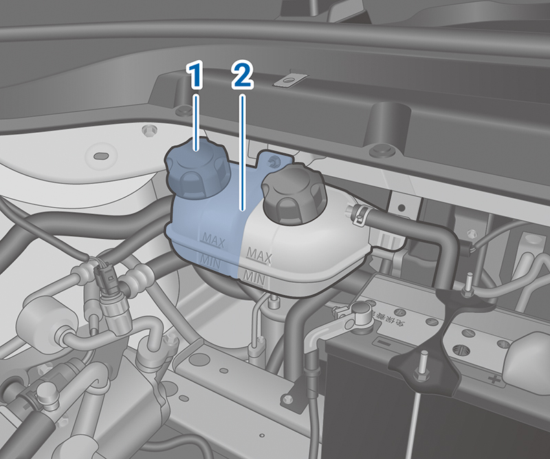 系統冷卻時,檢查儲液筒 2 的液面高度。若冷卻液液面低於“MIN”,則開啟儲液筒蓋 1 並將冷卻液加至“MAX”處。