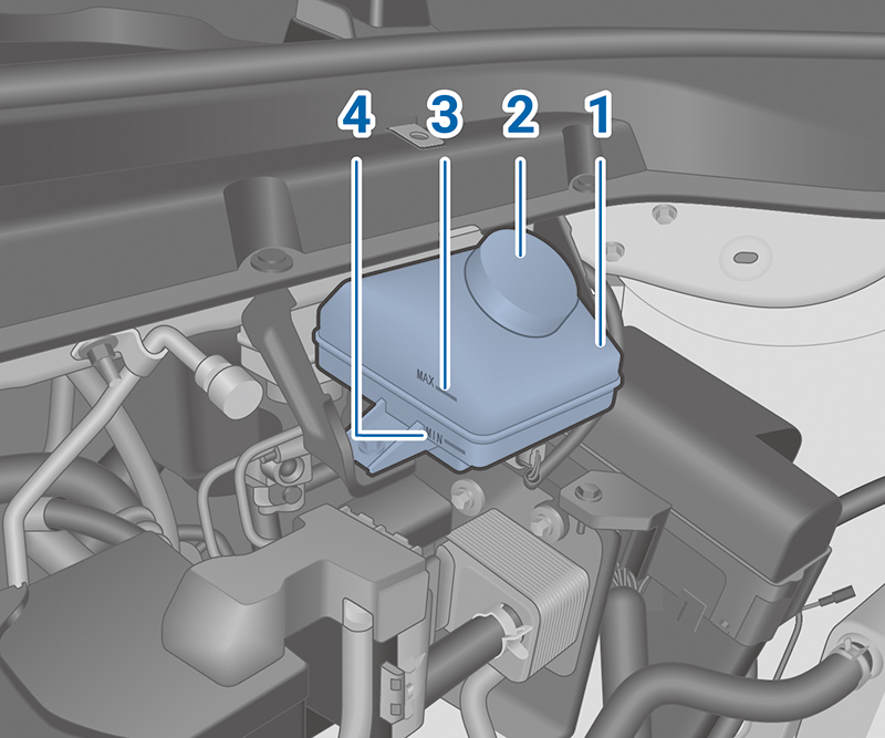 檢查儲油筒 1 內的煞車油高度。若煞車油高度在 MIN 4 以下或是煞車警告燈持續點亮,請打開儲油筒蓋 2 並加入原廠或同級品的煞車油到 MAX 3 位置。