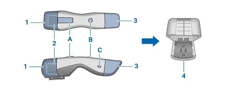 - 按下轉接頭上的電源按鈕 11,充電埠左上角的充電指示燈 12 亮起黃燈且供電指示燈 13 亦亮起黃 (微綠)燈。