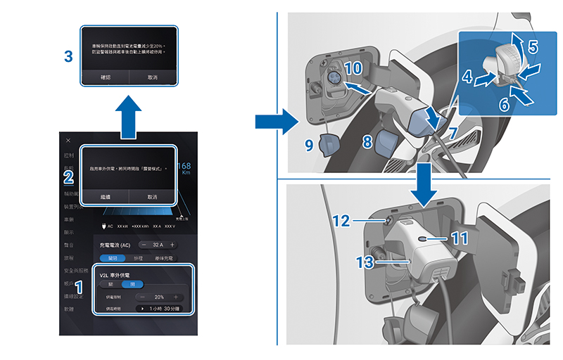 - 系統再次跳出提示訊息,再次點選“確認” 3 即可開啟 V2L 車外供電的操作畫面。