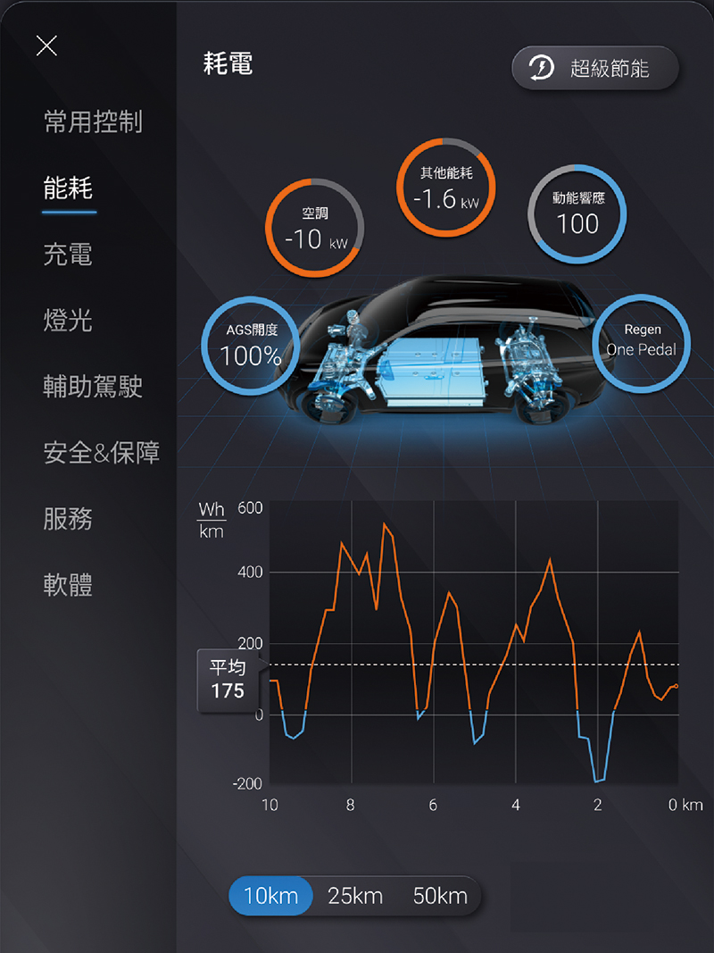 點選 10 km/25 km/50 km 可調整上方的能耗圖的區間設定;亦可對圖表顯示即時的能耗變化或能耗的平均變化進行切換。