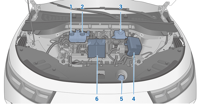 動力室中的配置需先將置物區飾蓋拆卸後才能看到。有關前行李廂飾蓋拆卸的進一步資訊,請參閱“車輛保養及清潔”章節中“前行李廂飾蓋拆卸”的說明。
